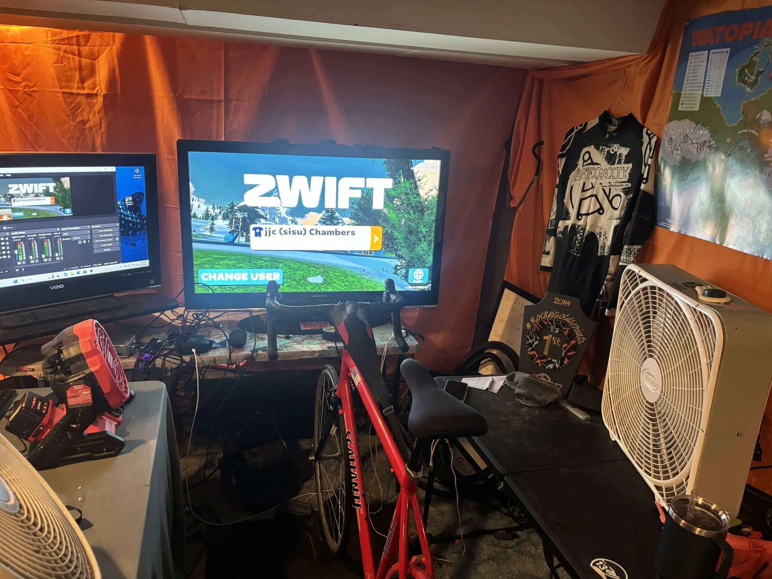 On race day, his setup is simple: Apple TV and a PC for recording in his basement gym. Nothing flashy. Just effective. Music is usually playing, coffee comes before the ride, and he’s very much a night owl racer.